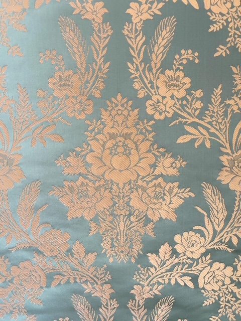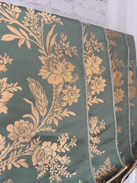 Estrecho dibujo San Felipe en rayón. Color Musgo. Metraje total: 3m x 0.64m cortados en fábrica en 4 caídas. Para chaleco, jubón o justillo.